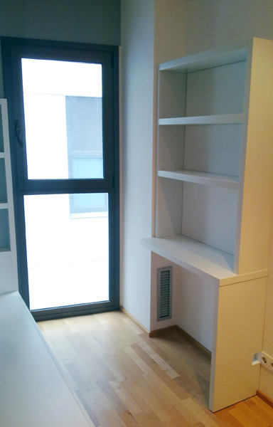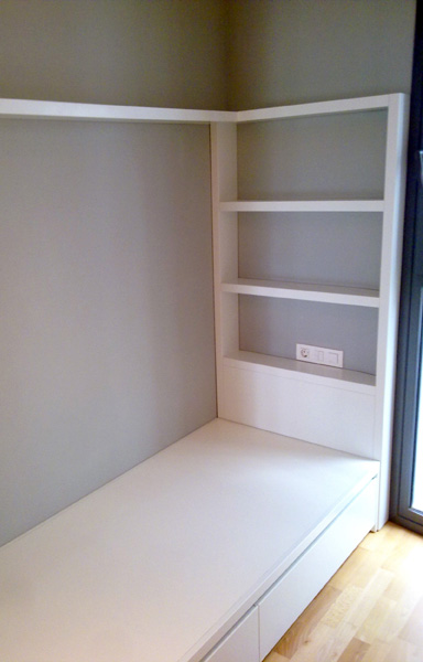 Habitació juvenil a mida amb llit, escriptori i llibreria lacada en blanc.