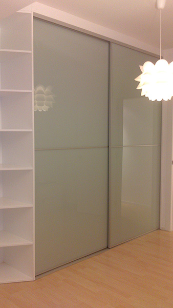 ene 22, 2016 Armarios Armario ropero empotrado con puertas correderas en cristal mate y módulo angular lacado blanco satinado. Instalación en calle Caspe, Barcelona.
