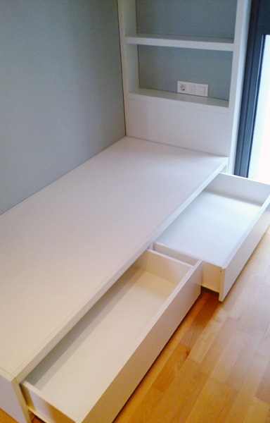 Habitación juvenil a medida con cama, escritorio y librería lacada en blanco.