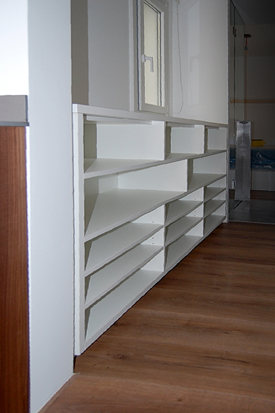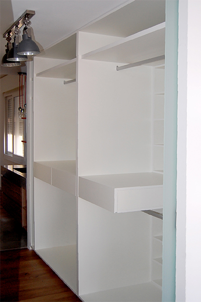 Mobiliario pasillo en melamina blanca compuesto por armario vestidor y armario zapatero.