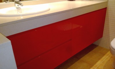 Mueble baño a medida bajo faldón de mármol lacado rojo con uñero y guías grass de extracción total con freno. Instalación en Barcelona.