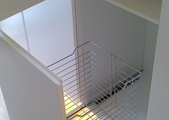 Mueble columna a medida lacado blanco con uñero. Tolva extraíble. Instalación en Barcelona