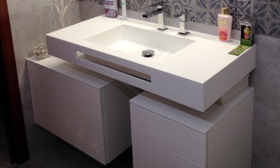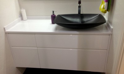 Mueble de baño suspendido a medida lacado blanco satinado con cierre push y cajones de extracción total. Instalación en Barcelona