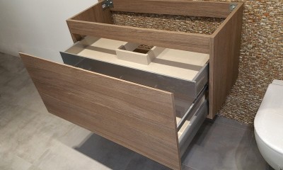 Mueble de baño suspendido a medida en melamina roble con uñero a inglete. Cajón y cajón interior con guía grass de extracción total con freno. Instalación en Barcelona