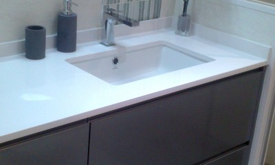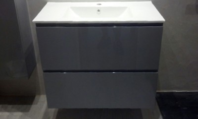 Mueble de baño suspendido lacado color brillo con 2 cajones con guía grass de extracción total con freno y encimera de porcelana. Instalación en Sant Cugat del Vallés