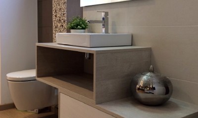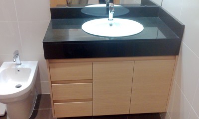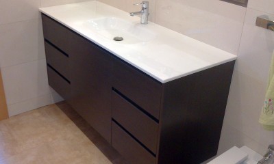 Mueble de baño suspendido bajo faldón en rechapado barnizado con uñero. Cajones con guía de extracción total con freno. Instalación en Barcelona